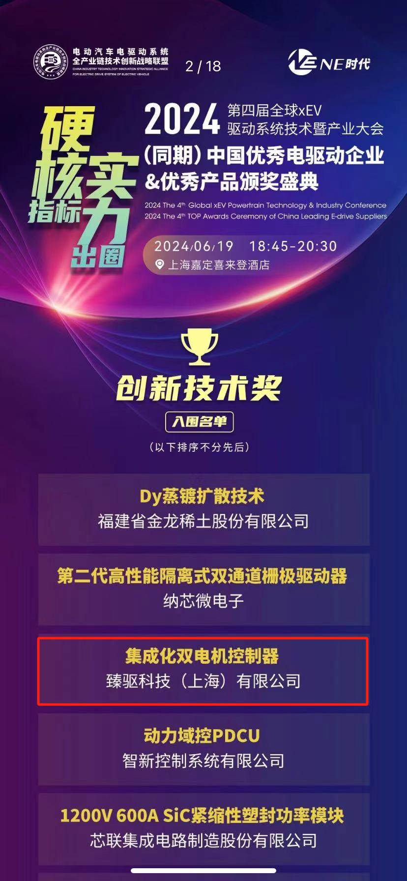 6月19日,由NE時代舉辦的2024第四屆全球xEV驅動系統技術暨產業大會在上海隆重召開,同期舉行了中國優秀電驅動企業&優秀產品頒獎盛典。臻驅科技(上海)有限公司(下稱“臻驅科技”)憑借行業領先的產品研發和技術創新能力,榮獲中國電驅動產業技術創新獎,并入選雙電控TOP企業。